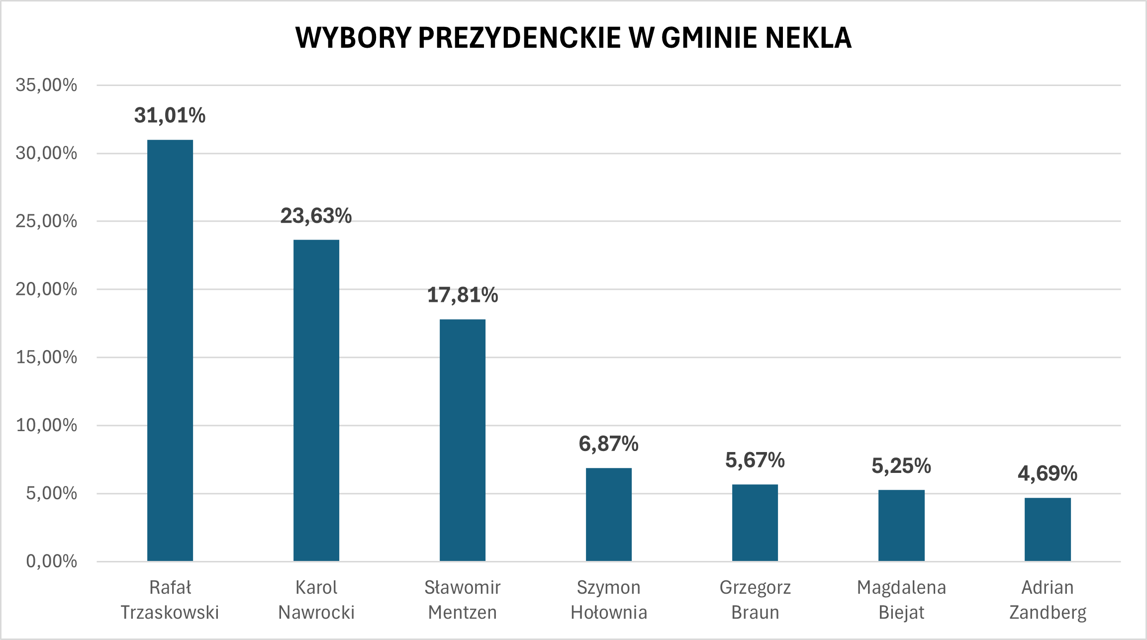WYBORY PREZYDENCKIE W GMINIE NEKLAWyniki głosowania w pierwszej turze w wyborach Prezydenta Rzeczypospolitej Polskiej w 2025 r. - GMINA NEKLA.Frekwencja wyniosła 67,31%. |